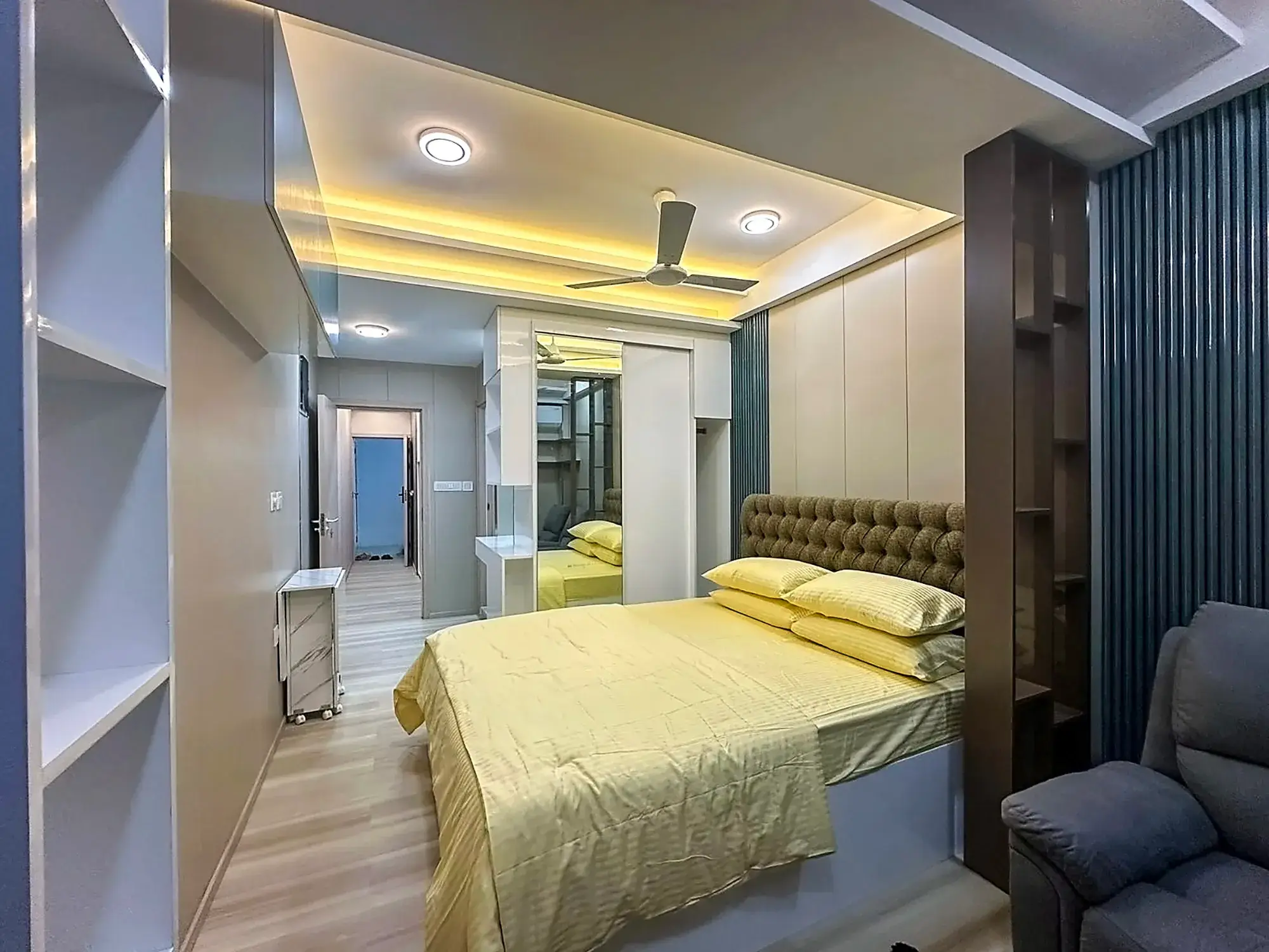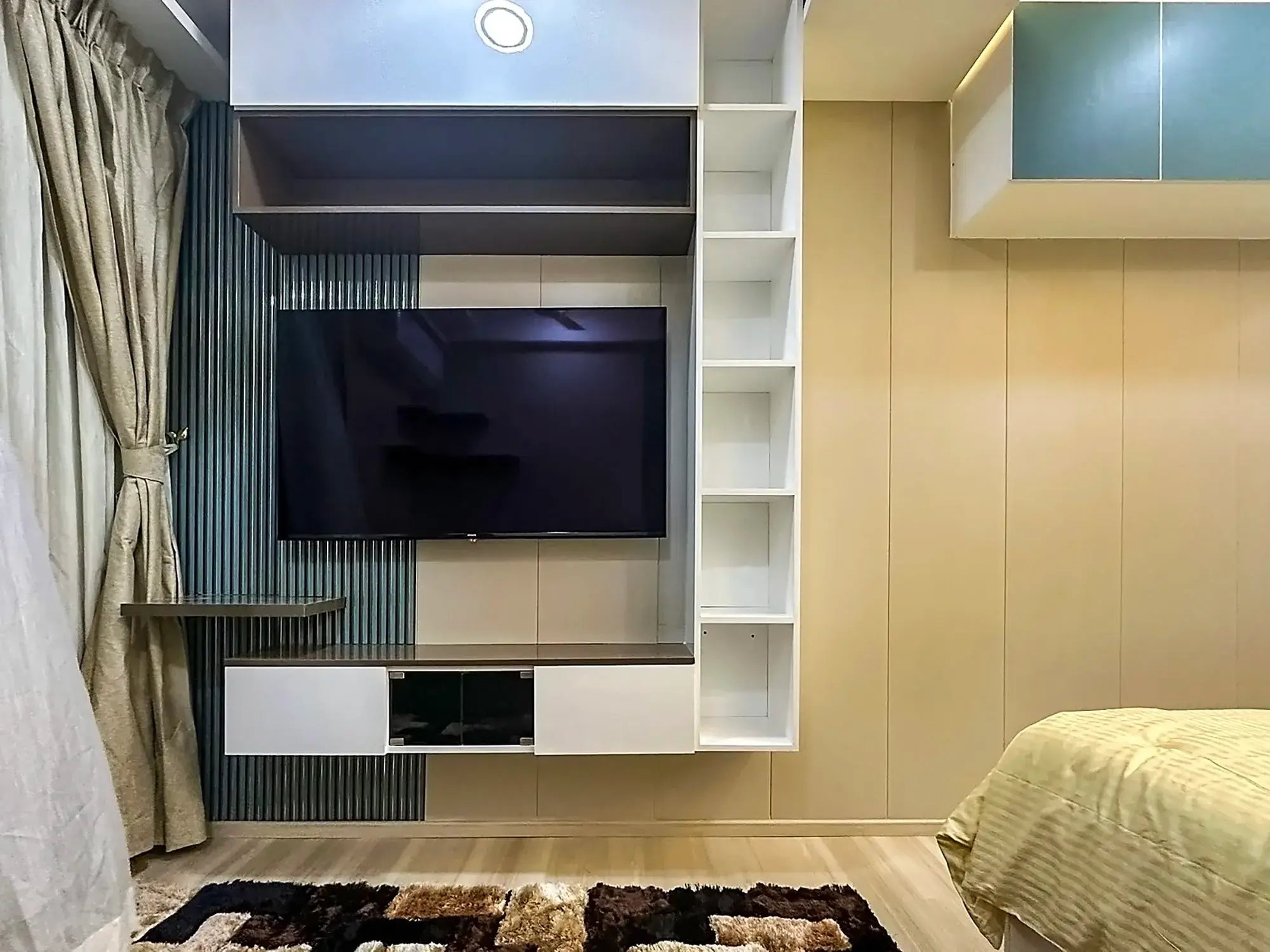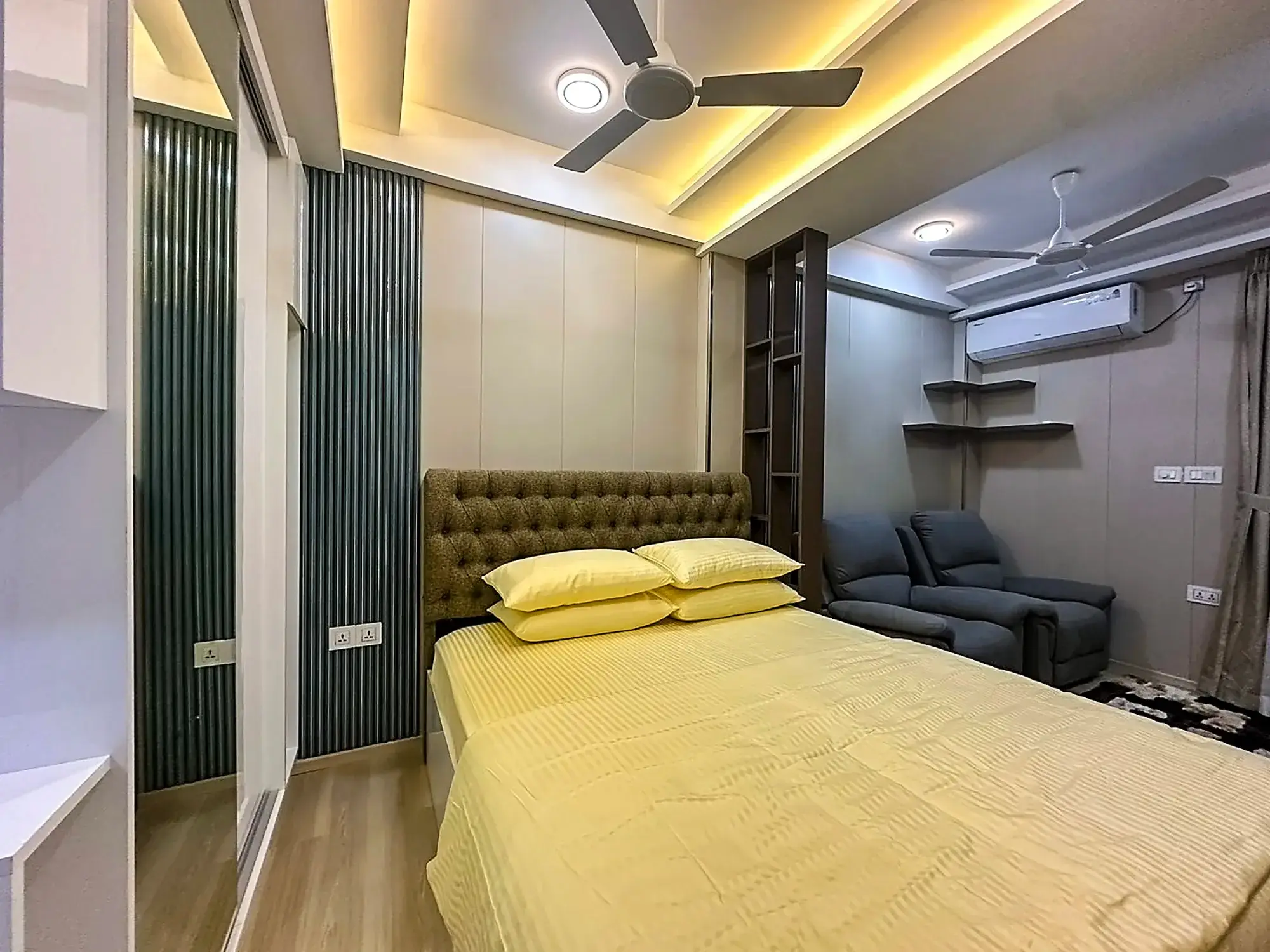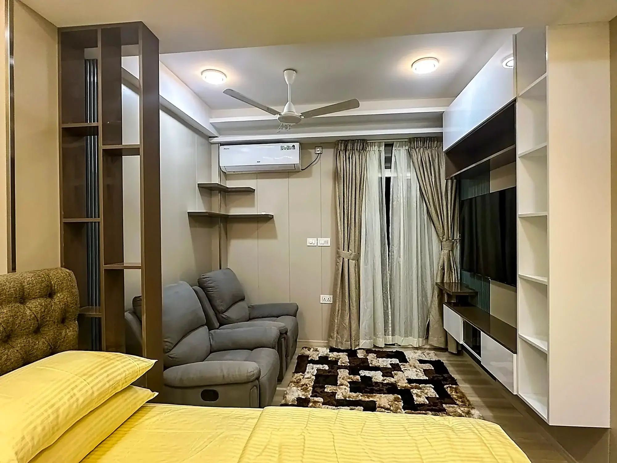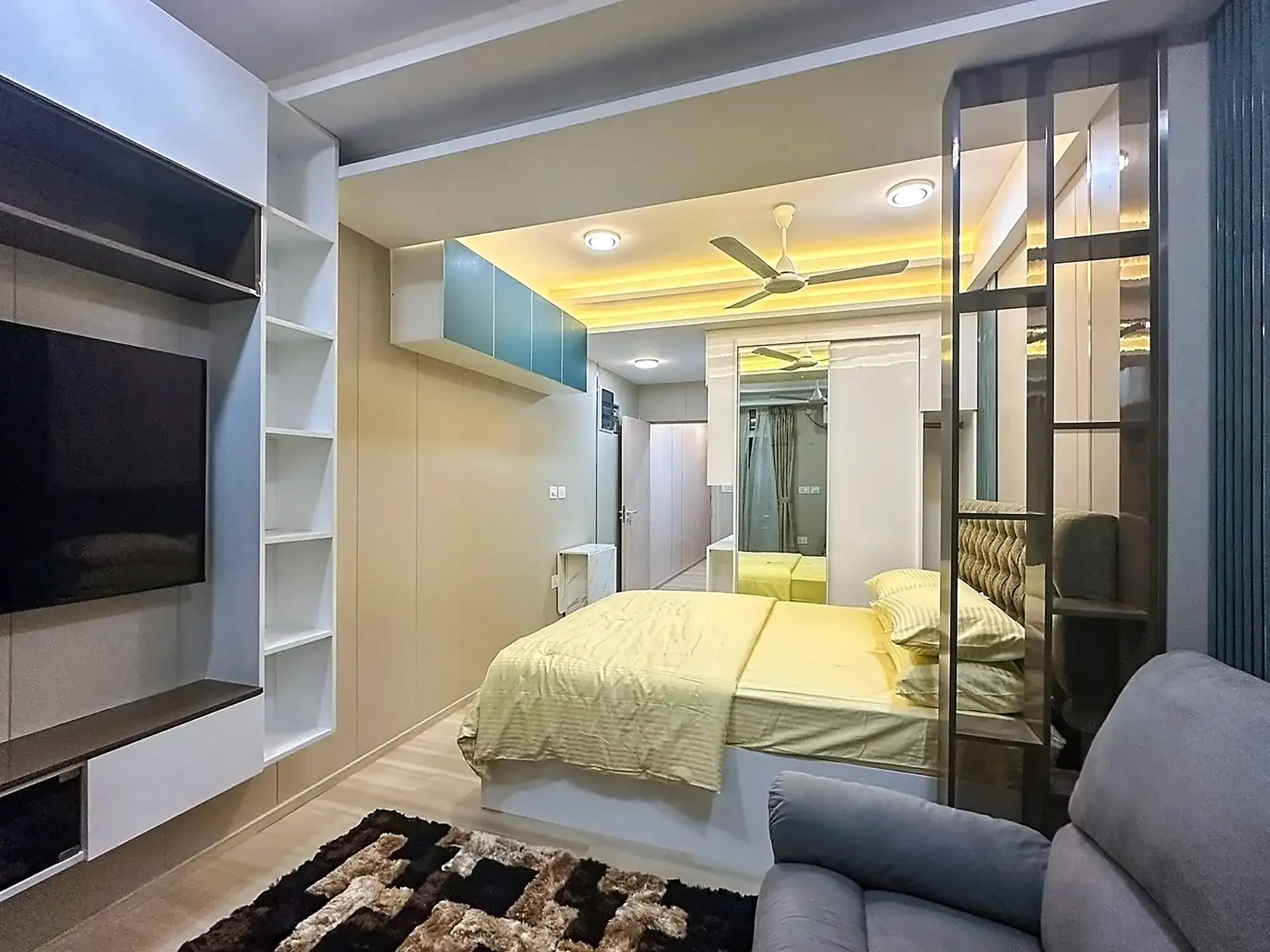 The building is equipped with a lift, access control system and CCTV surveillance in common areas, ensuring safety and convenience. Inside, the apartment features elegant parquet flooring, a comfortable recliner sofa, a queen-sized bed with complete bedding and a wall-mounted 55” Smart TV, creating a modern and comfortable living environment.