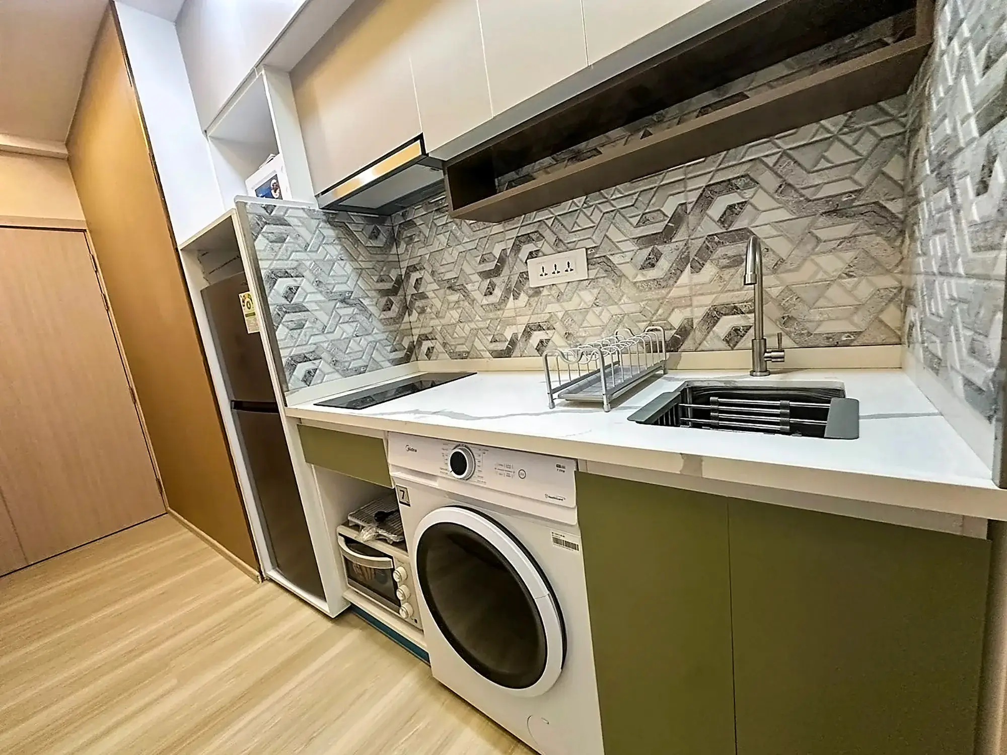 The kitchen is fully equipped with modern appliances including a refrigerator, microwave, oven, electric stove, washing machine, kettle and essential cookware. The rental price is inclusive of electricity and water, offering hassle-free living with predictable monthly expenses. WiFi and MediaNet Cable TV are also provided as part of the setup.