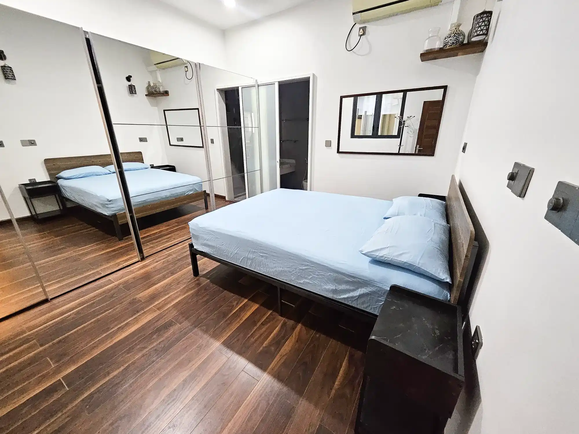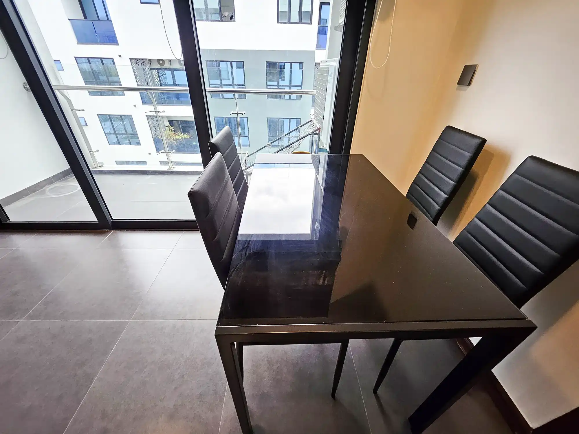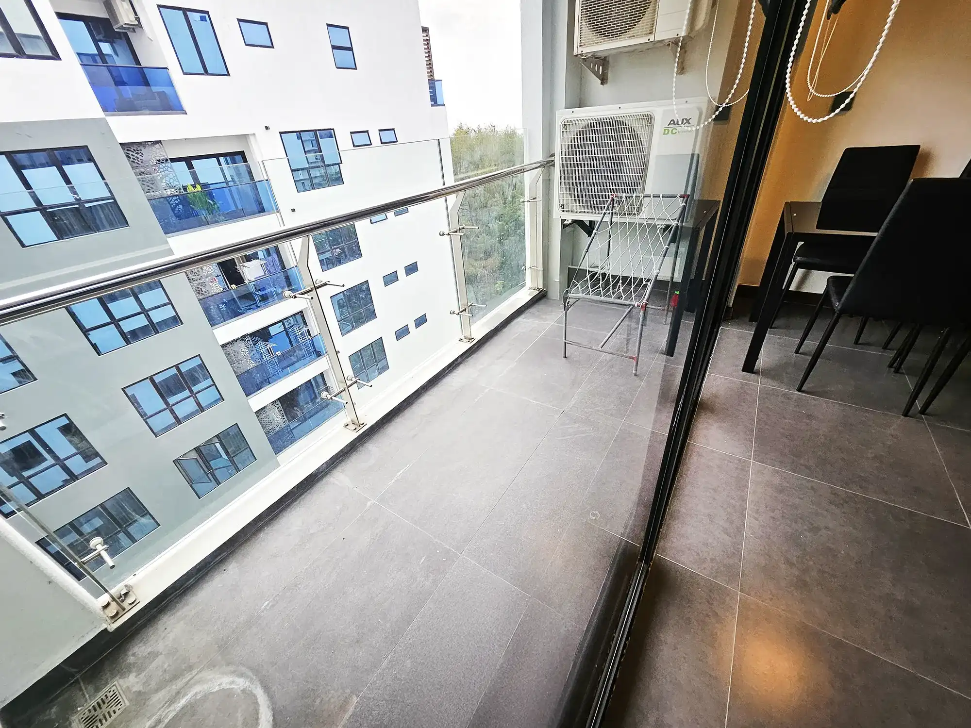 This fully furnished 2-bedroom apartment is located on the 7th floor and features two spacious bedrooms, each with its own attached bathroom. The apartment is fully air-conditioned throughout, including the living and kitchen areas. It is designed with a modern open kitchen layout, a separate laundry room, and a balcony offering city views.