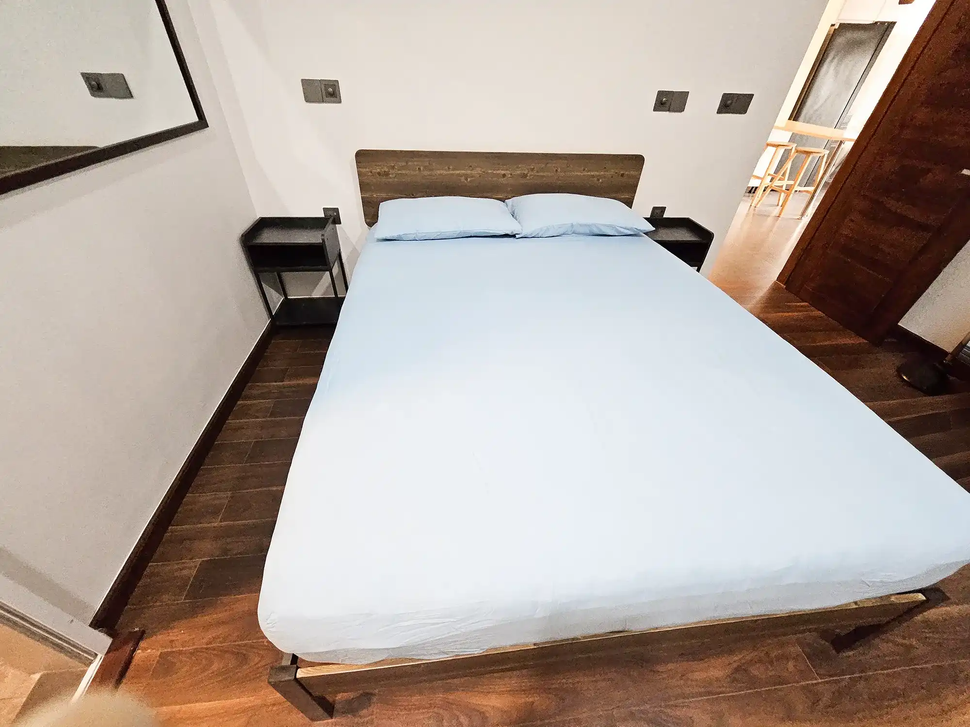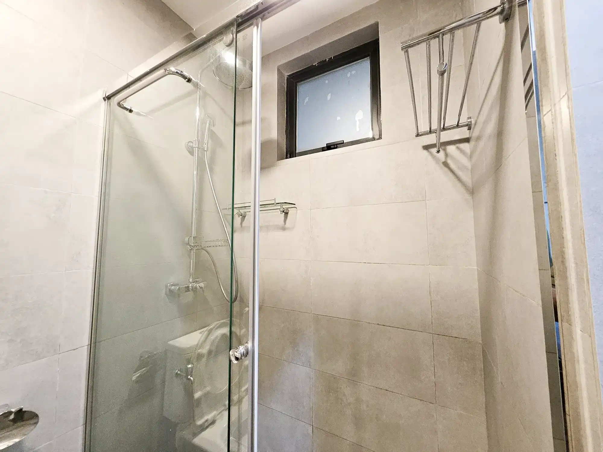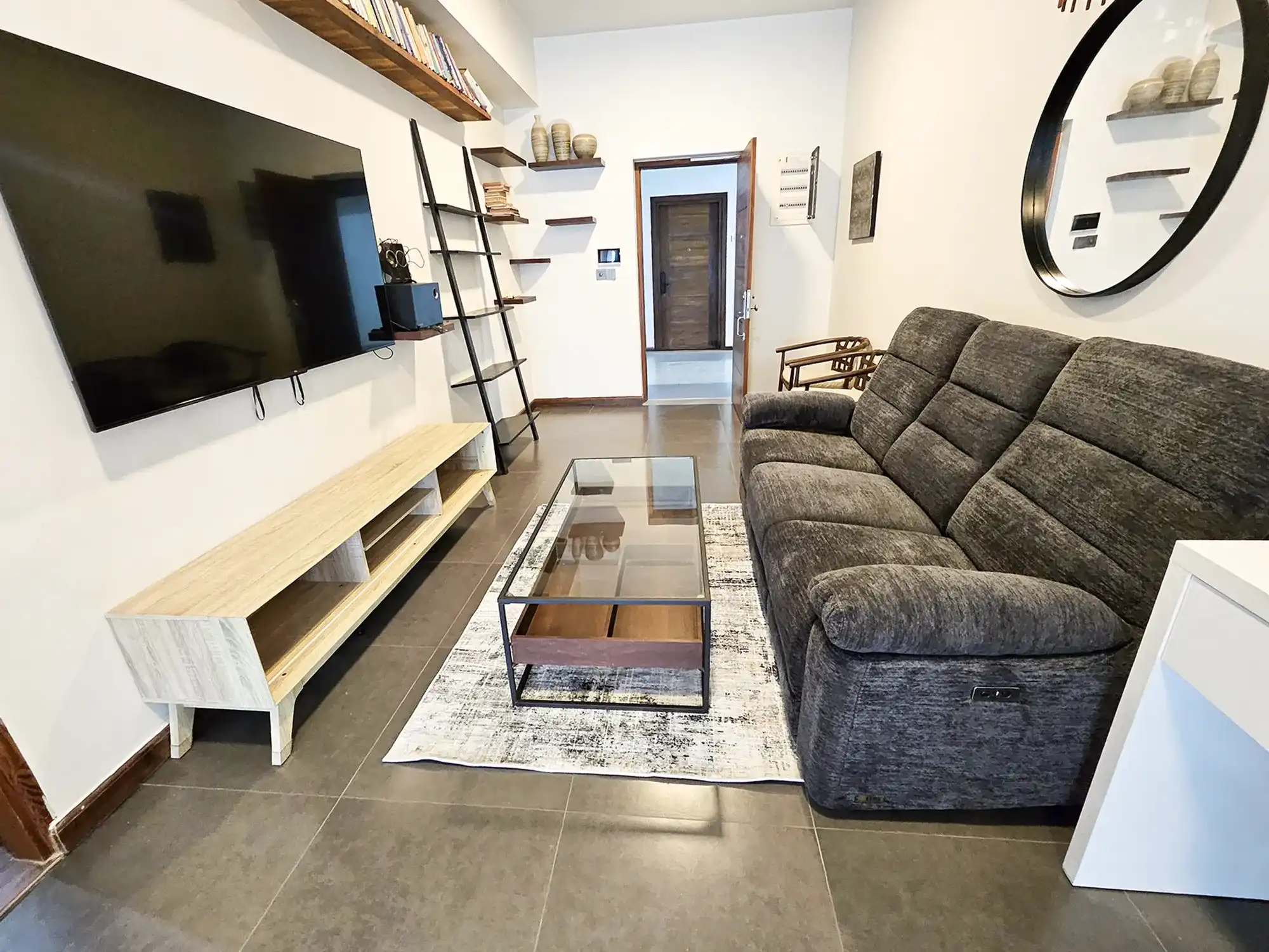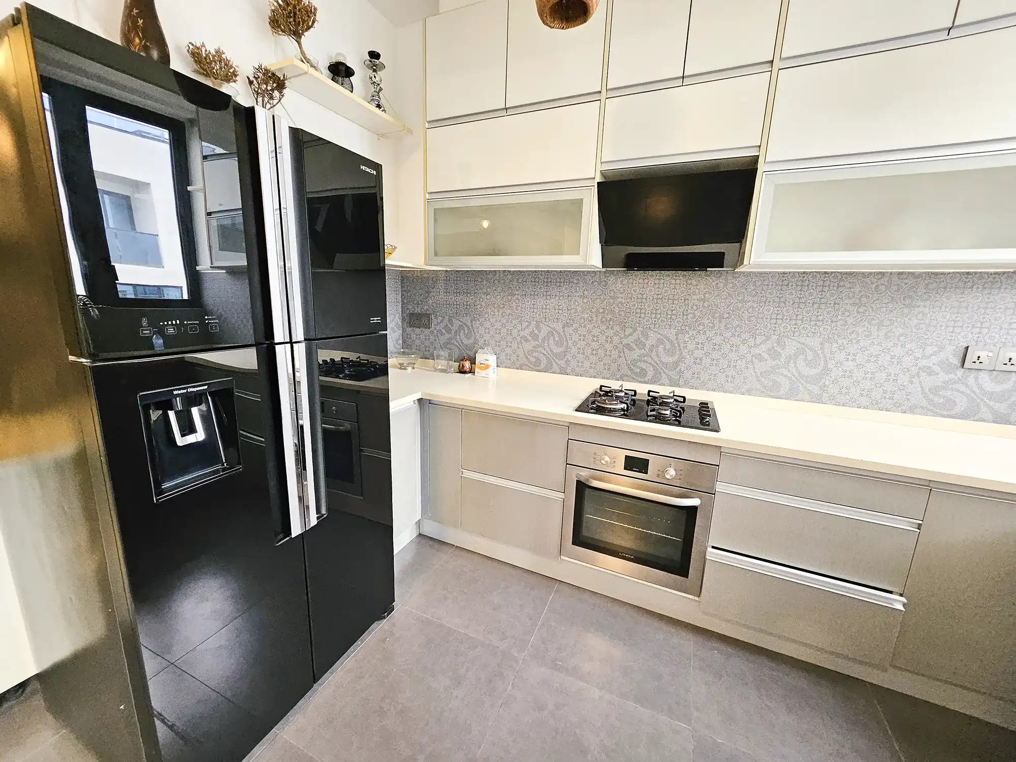 This fully furnished 2-bedroom apartment is located on the 7th floor and features two spacious bedrooms, each with its own attached bathroom. The apartment is fully air-conditioned throughout, including the living and kitchen areas. It is designed with a modern open kitchen layout, a separate laundry room, and a balcony offering city views.