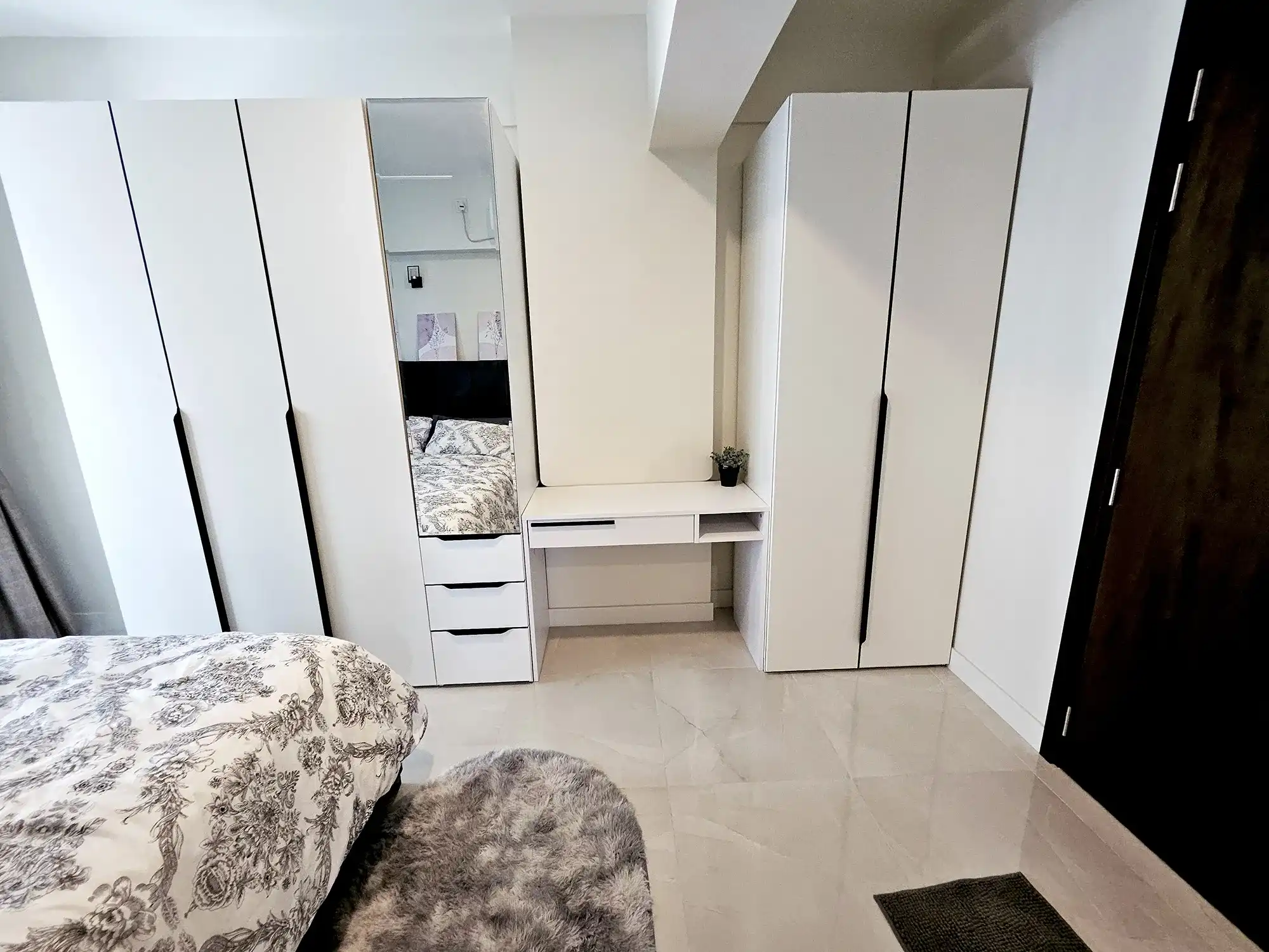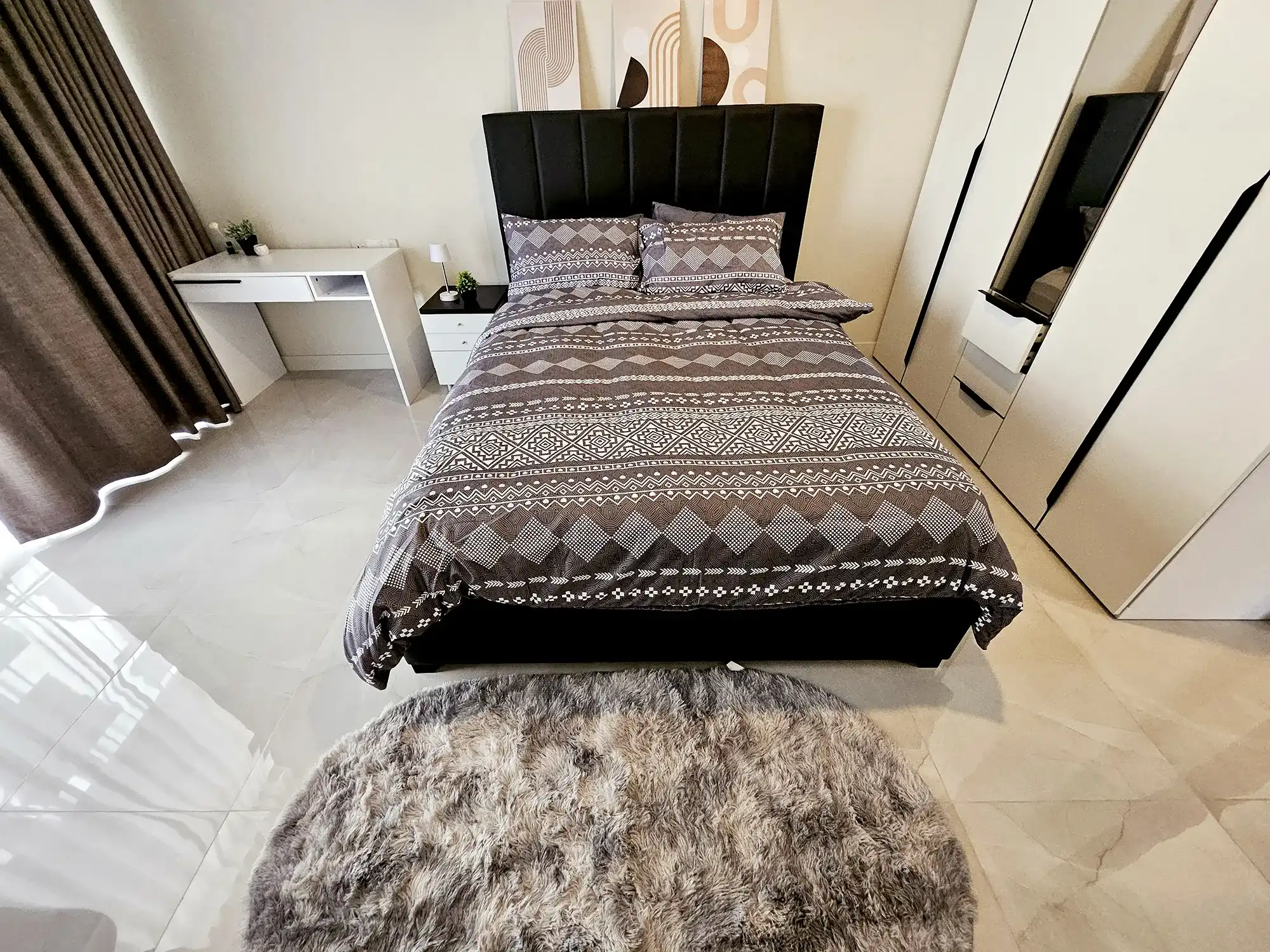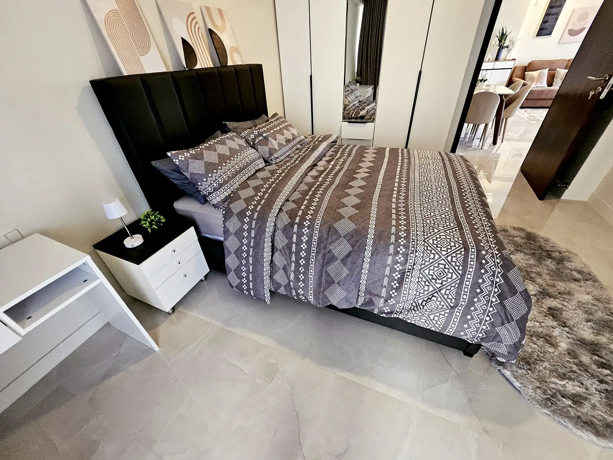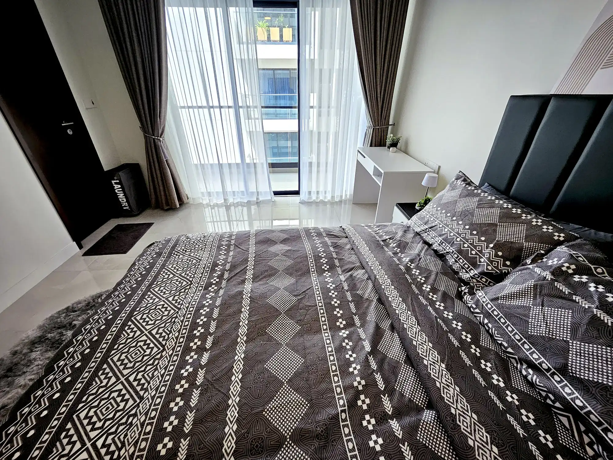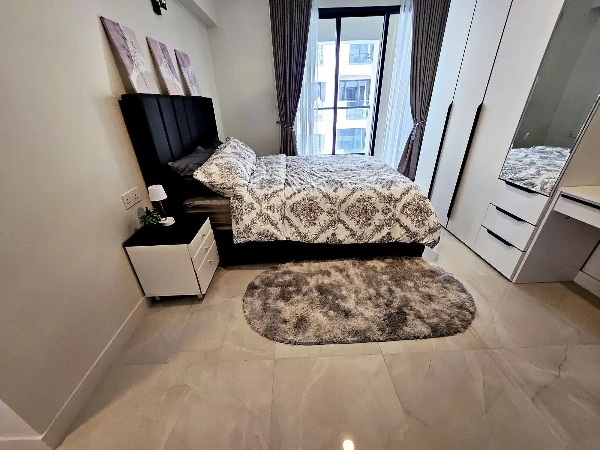 This fully furnished 3-bedroom apartment is situated on the 6th floor and features elegant contemporary interiors throughout. Each bedroom includes an attached bathroom fitted with branded sanitary ware and the entire apartment is fully air-conditioned, including the kitchen and living area. The layout also includes a separate laundry room, a TV rack in the living area, and three spacious city-view balconies that allow ample natural light and fresh air to flow through the apartment.