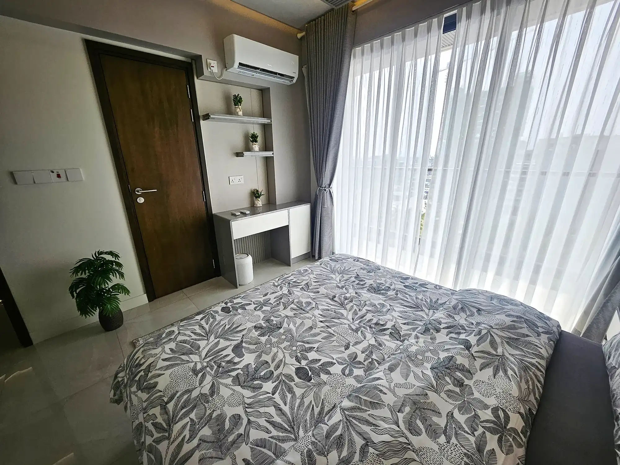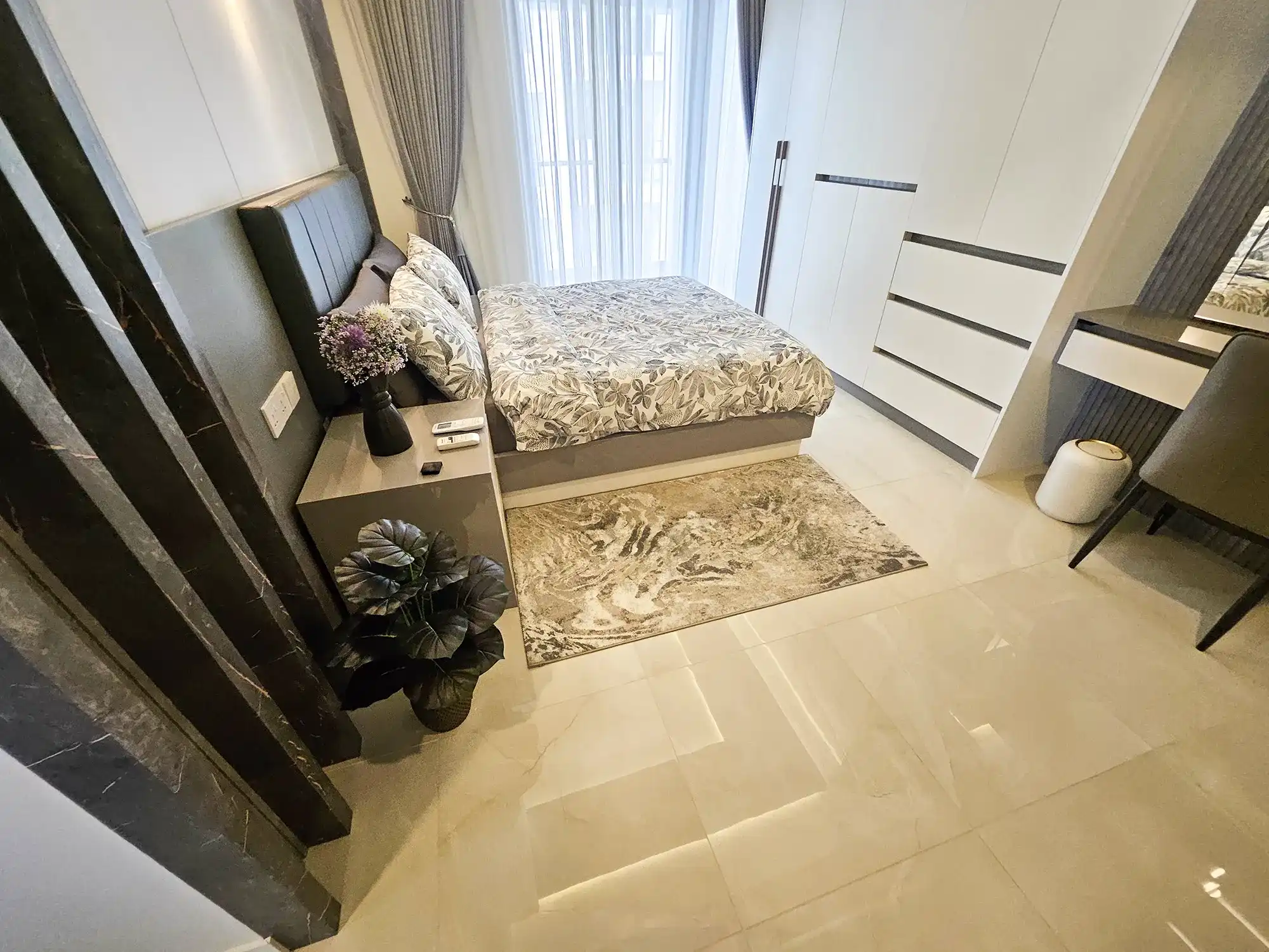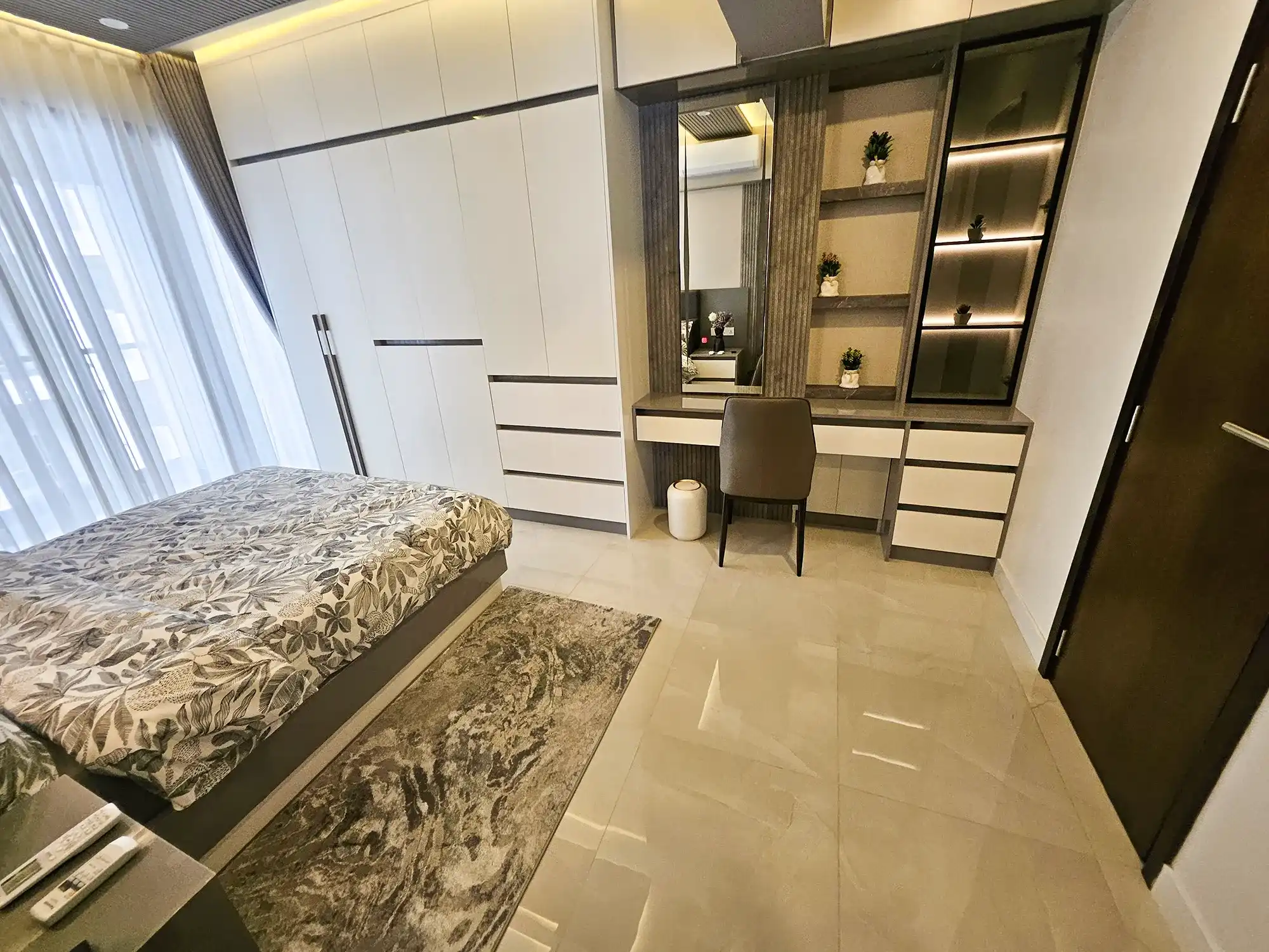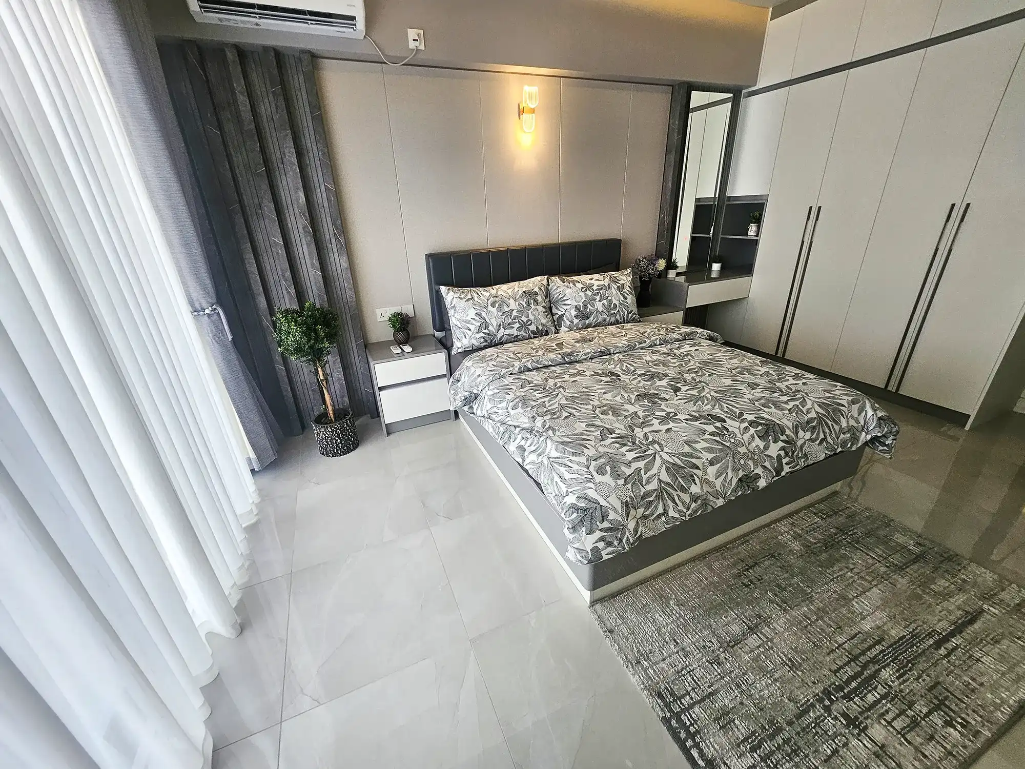This fully furnished 3-bedroom apartment is situated on the 9th floor and features elegant contemporary interiors throughout. Each bedroom includes an attached bathroom fitted with branded sanitary ware and the entire apartment is fully air-conditioned, including the kitchen and living area. The layout also includes a separate laundry room and three spacious city-view balconies that allow ample natural light and fresh air to flow throughout the apartment.