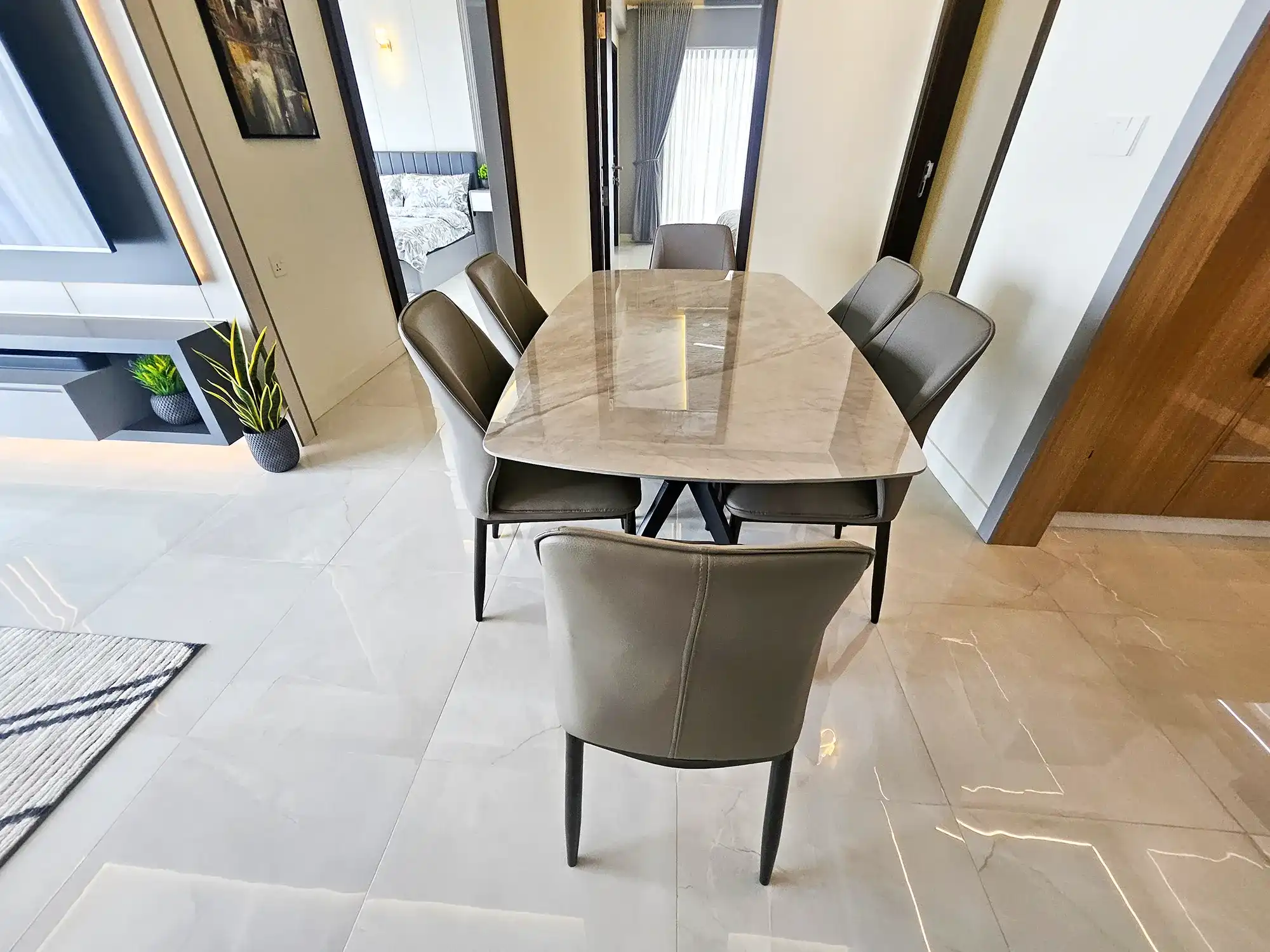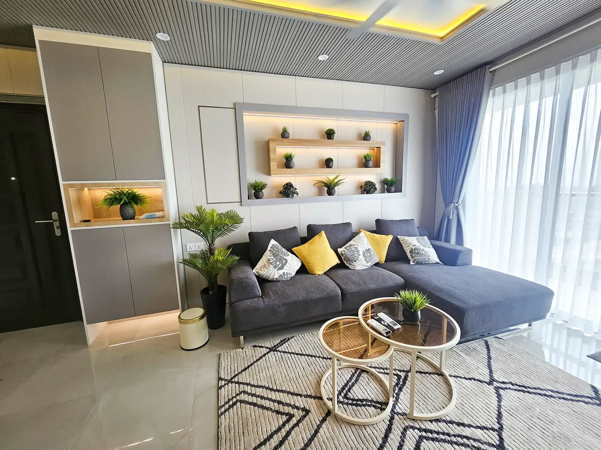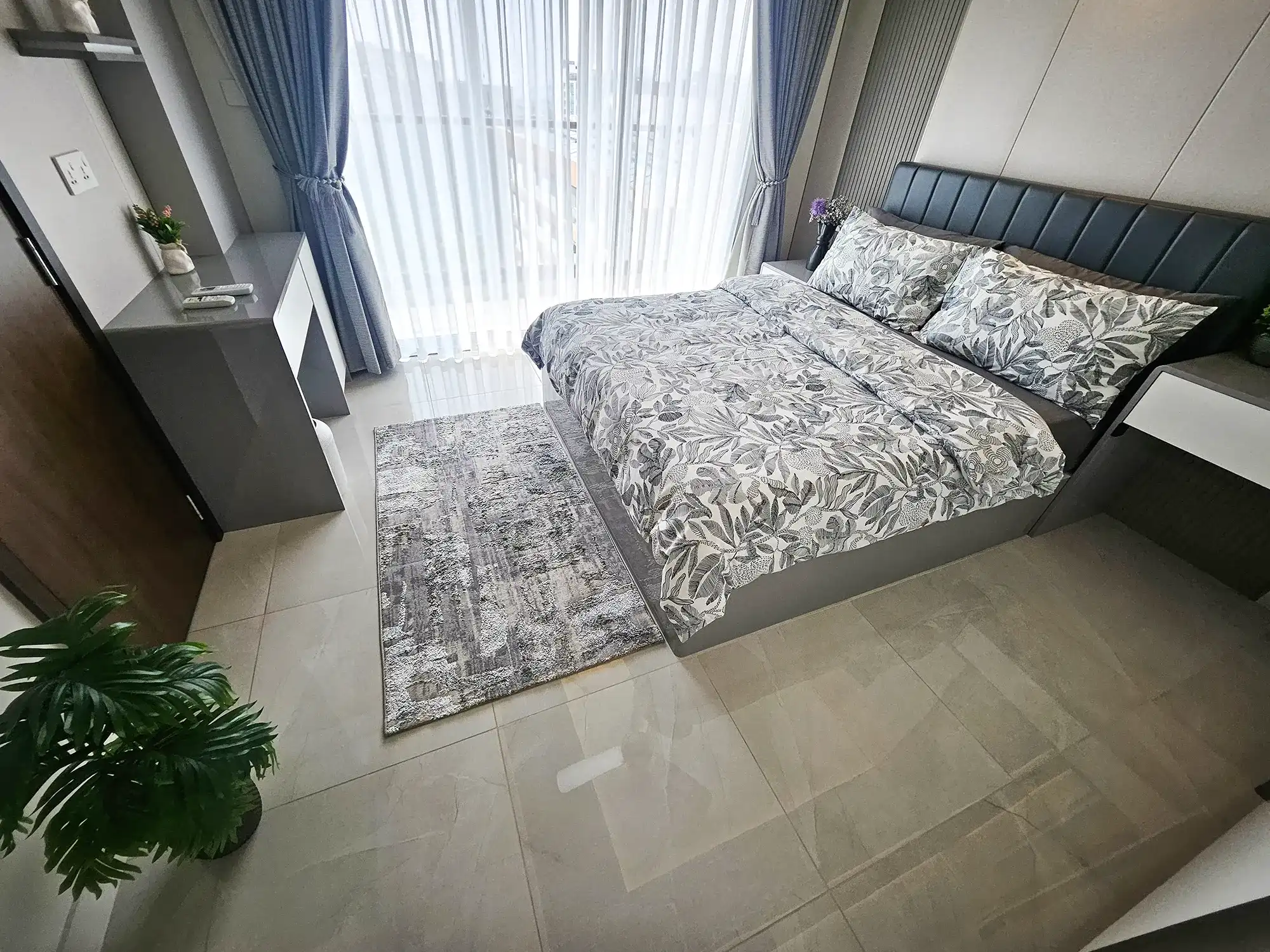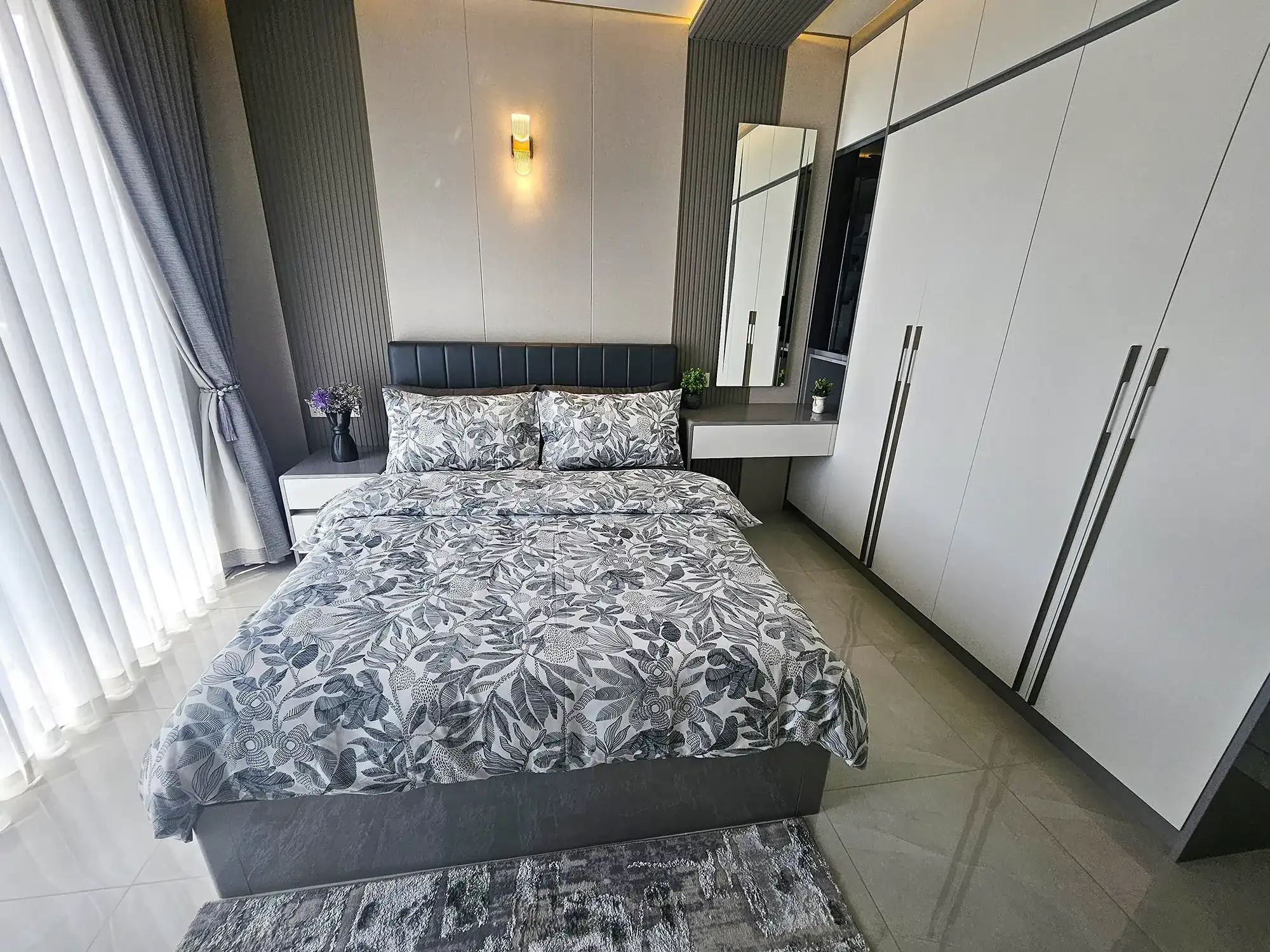 This fully furnished 3-bedroom apartment is situated on the 9th floor and features elegant contemporary interiors throughout. Each bedroom includes an attached bathroom fitted with branded sanitary ware and the entire apartment is fully air-conditioned, including the kitchen and living area. The layout also includes a separate laundry room and three spacious city-view balconies that allow ample natural light and fresh air to flow throughout the apartment.