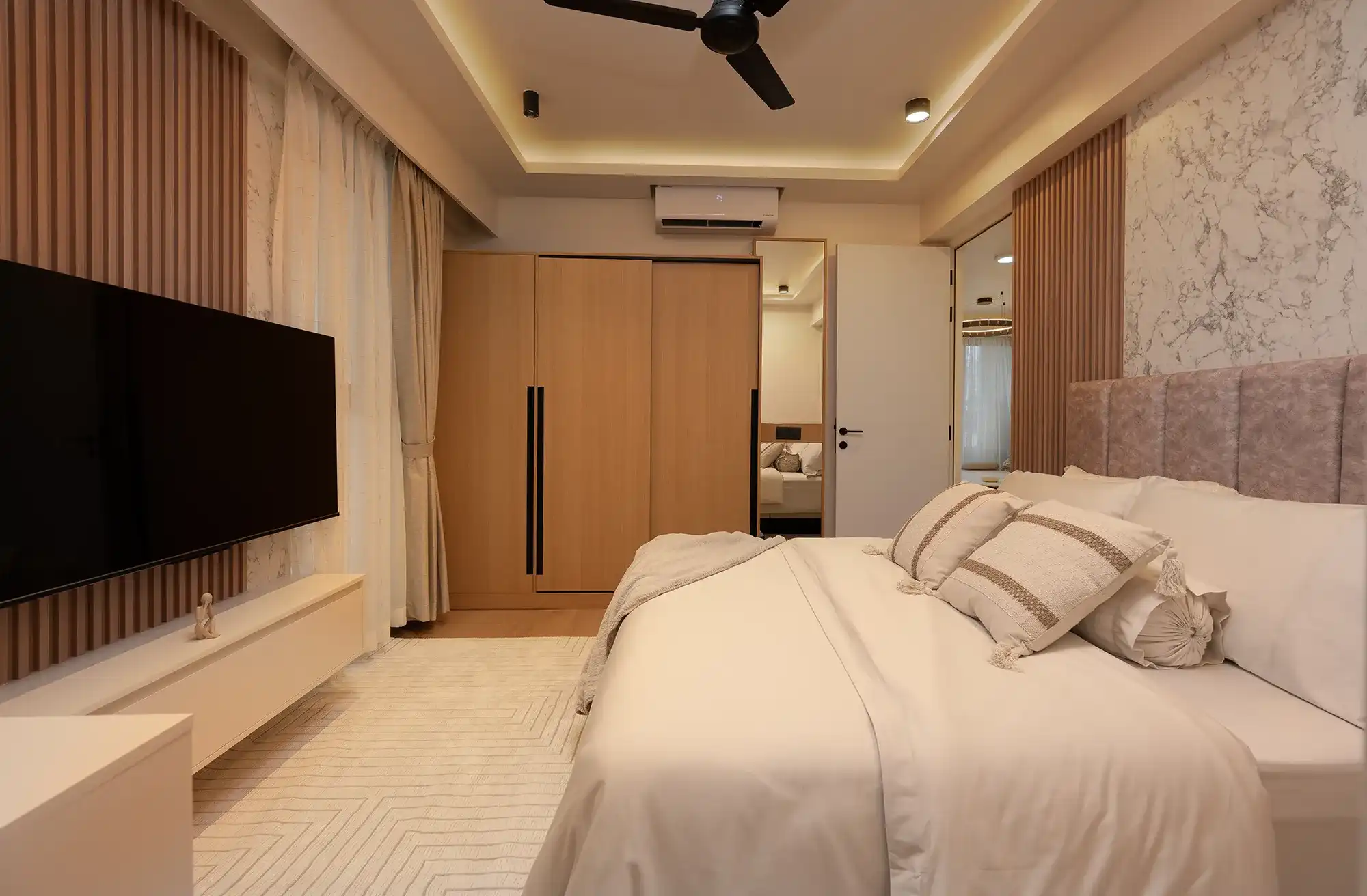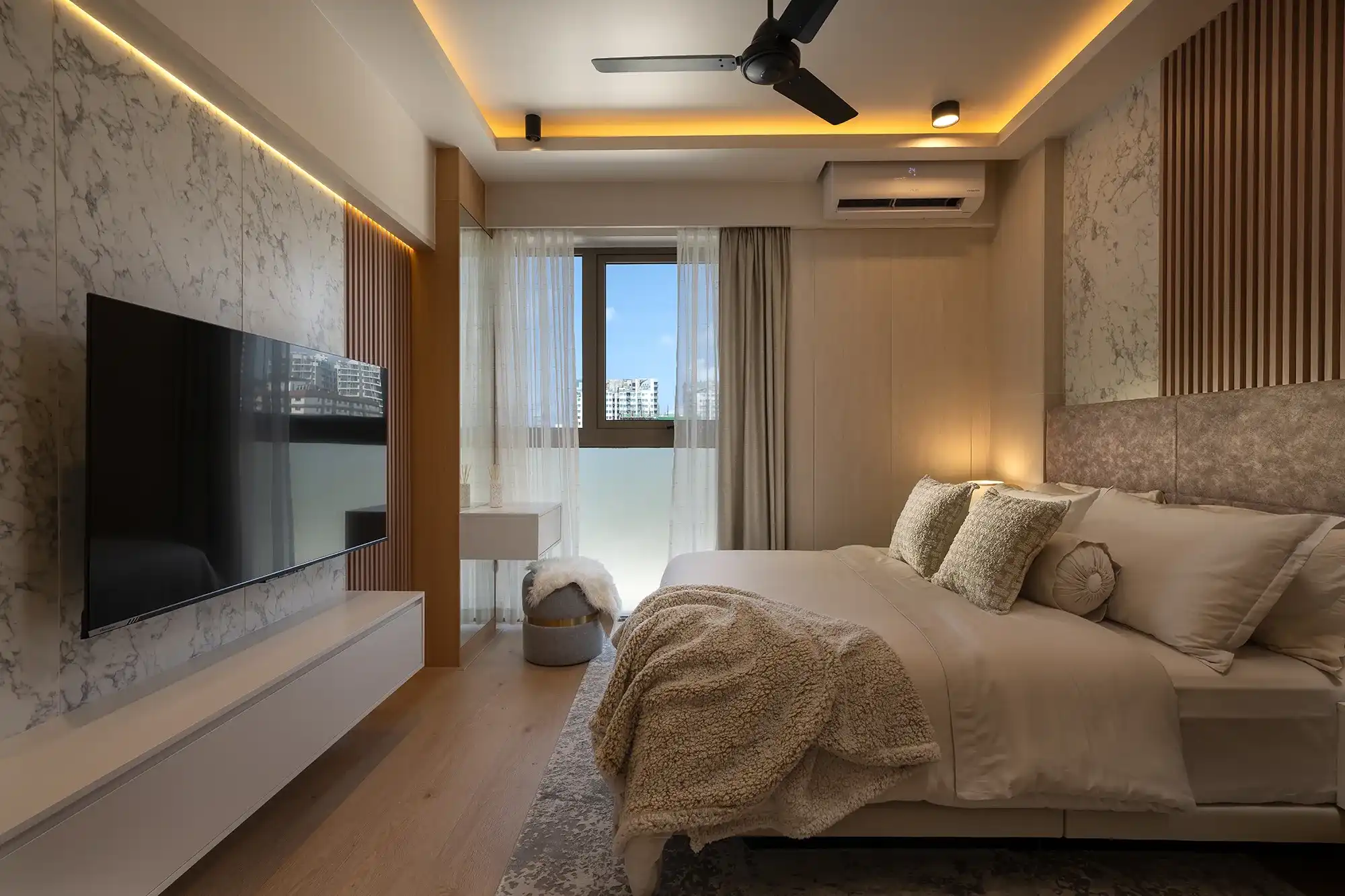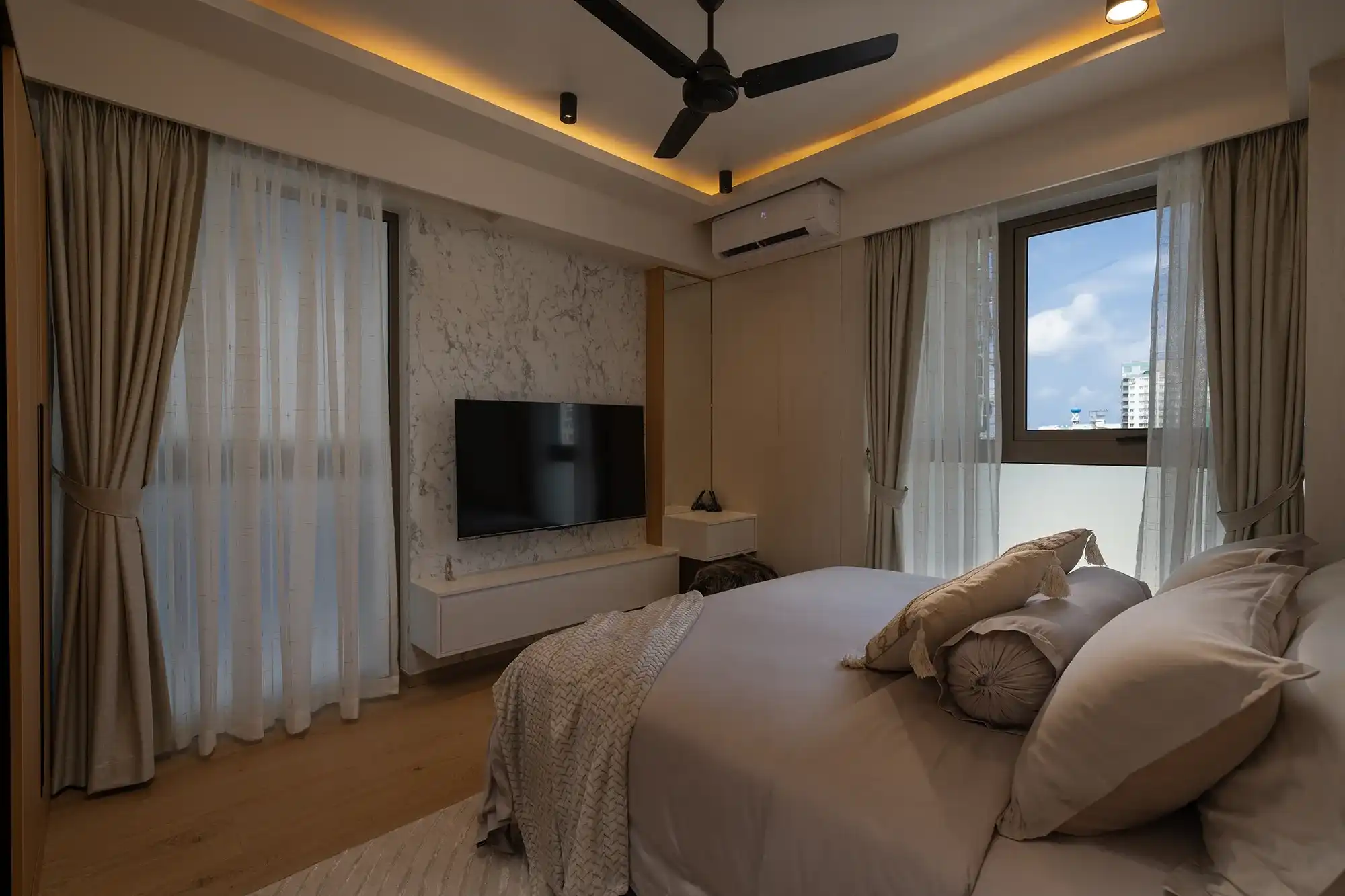 The apartment includes 3 spacious bedrooms plus a maid’s/laundry room (flexible as a 4th), 3 modern bathrooms, a chef’s kitchen with built-in appliances, and a bright, fully air-conditioned layout. Designed with abundant storage, premium furniture, and 5-star hotel bedding, it ensures comfort and convenience at every turn. Entertainment upgrades include a 65” OLED TV in the living room and TVs in each bedroom. Move-in ready with plates, cutlery, cookware, linens, towels, washer/dryer, and essentials provided. Additional convenience includes 2 reserved motorcycle parking bays.