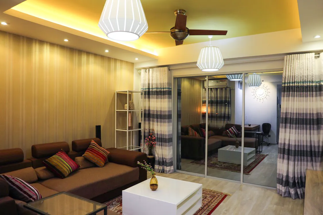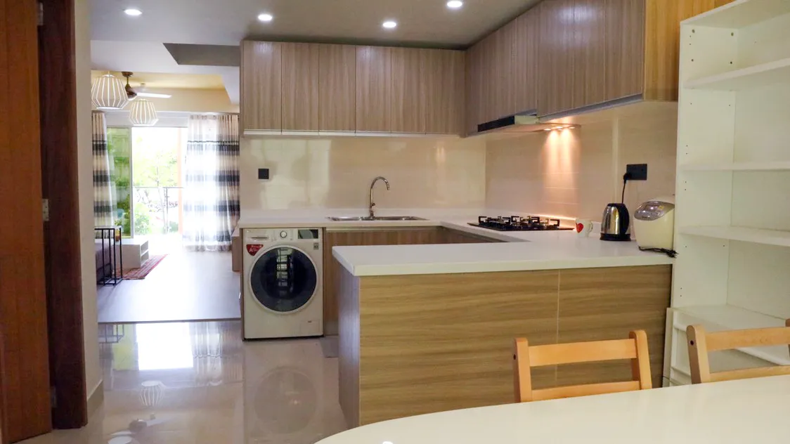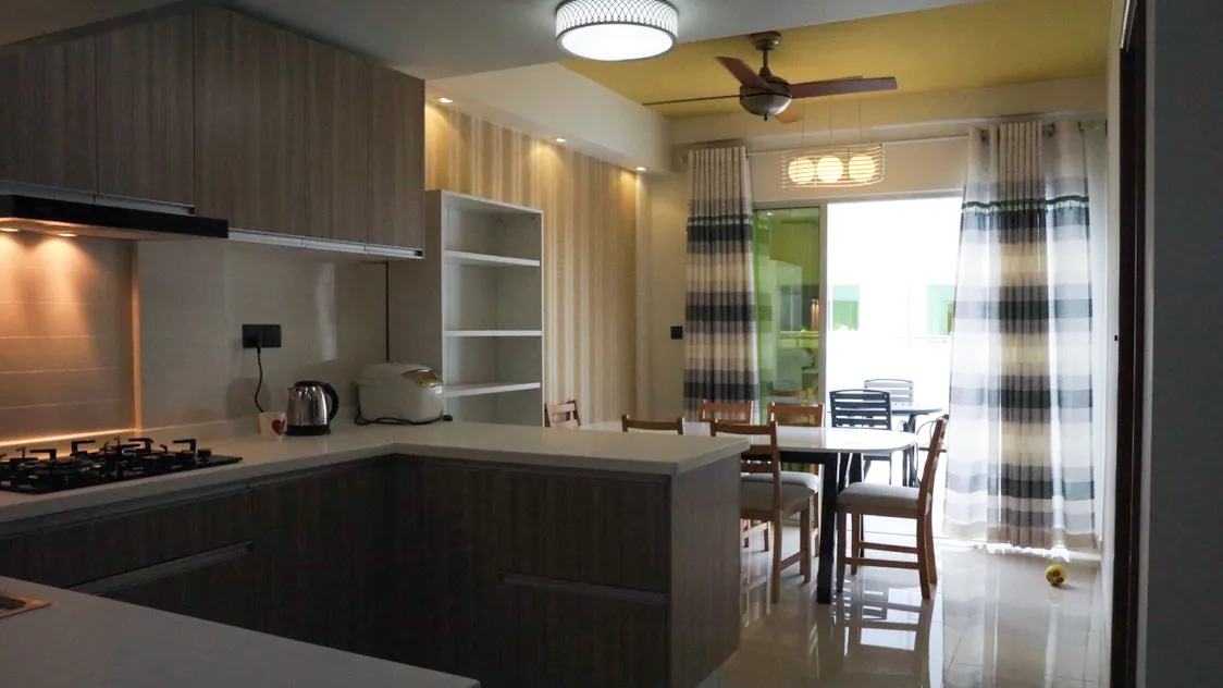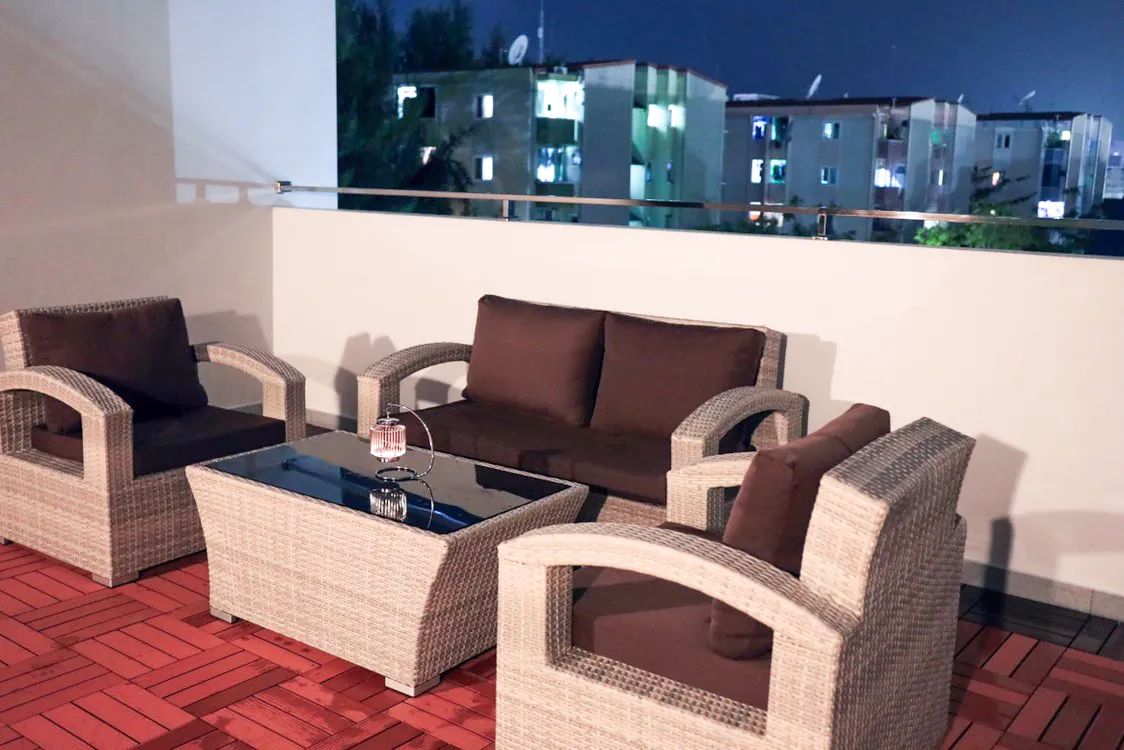The apartment is arranged across multiple levels and features spacious bedrooms with attached bathrooms, providing a good balance of privacy and functionality for families. The entire unit is fully air-conditioned and designed to allow good natural ventilation throughout. The layout includes an open-plan kitchen and living space, along with a private terrace and city-view balconies overlooking Hithigas Magu 5.