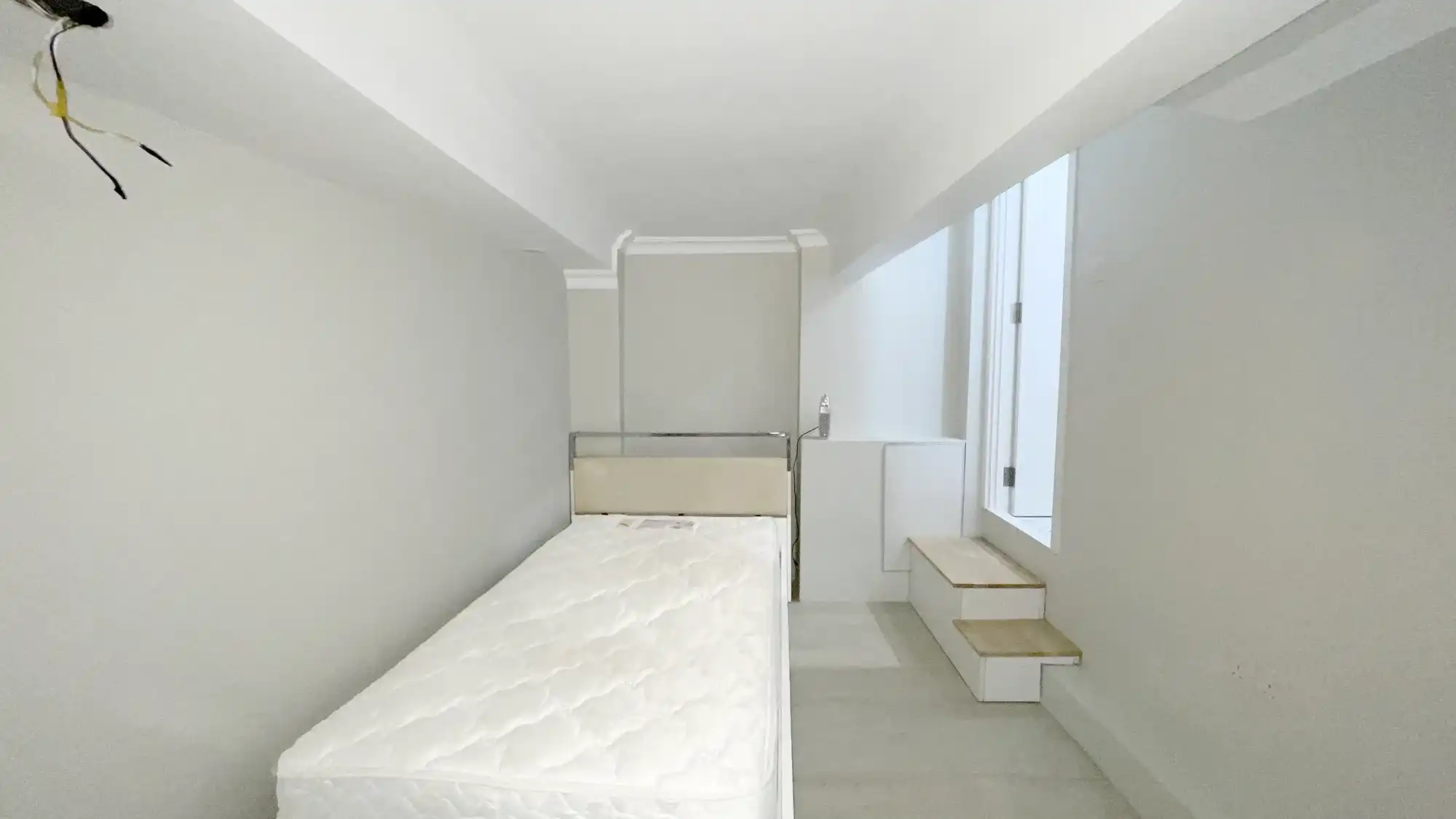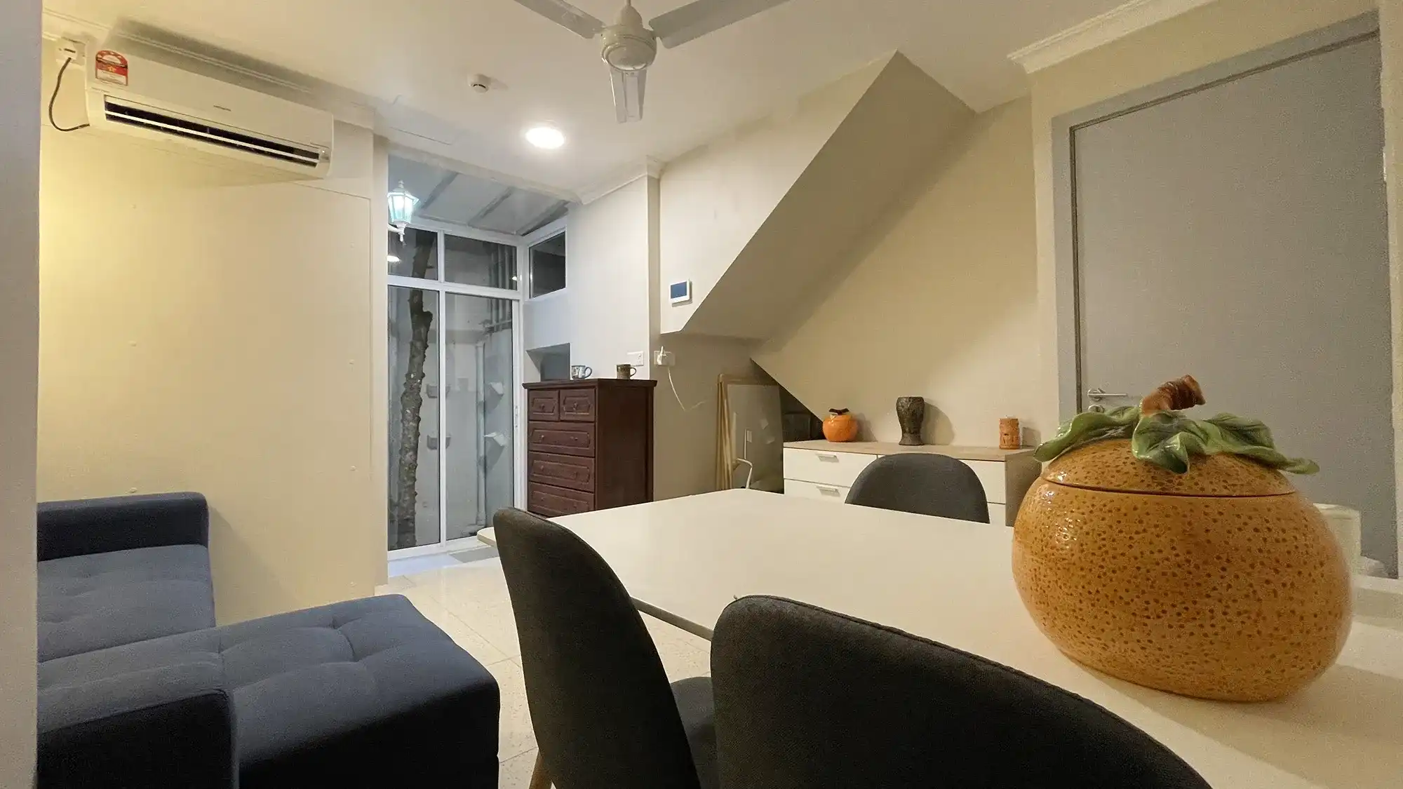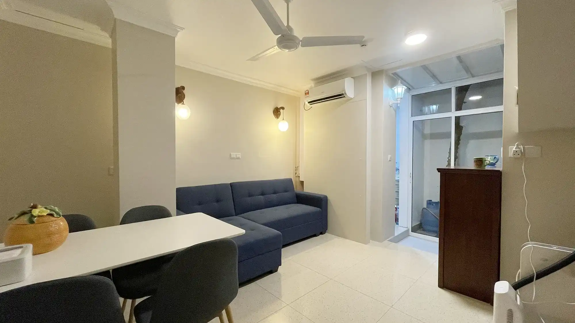 The apartment features a bedroom with an attached bathroom and comes semi furnished. It is fully air-conditioned and includes an open kitchen layout and a small backyard area, providing a simple and practical living arrangement for one person seeking a central Male' location.