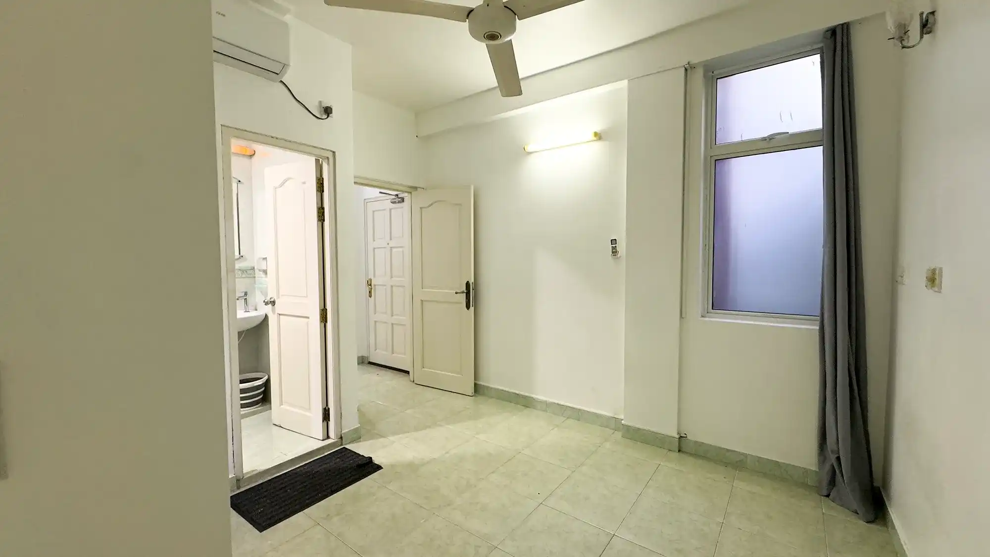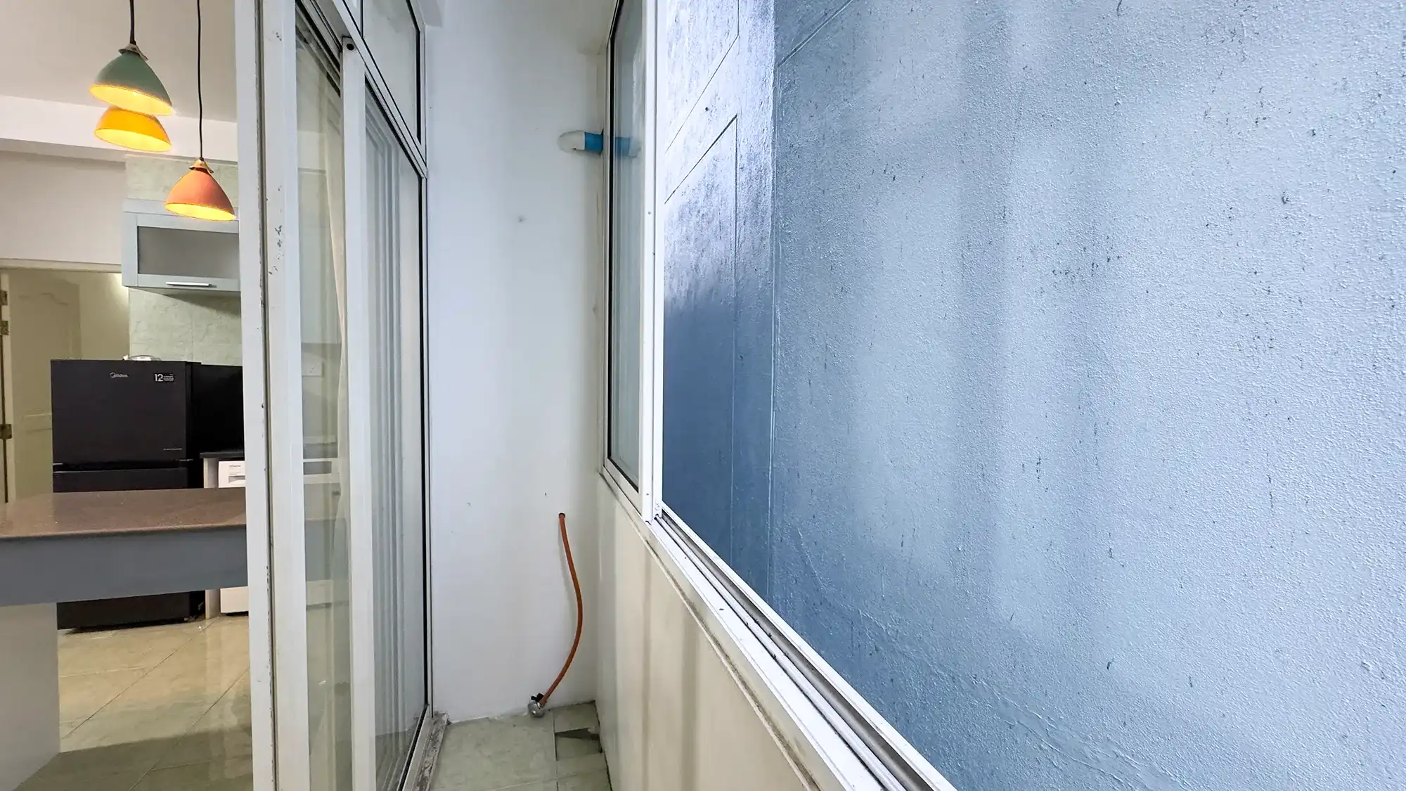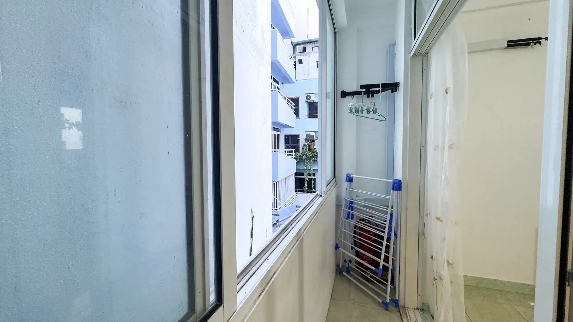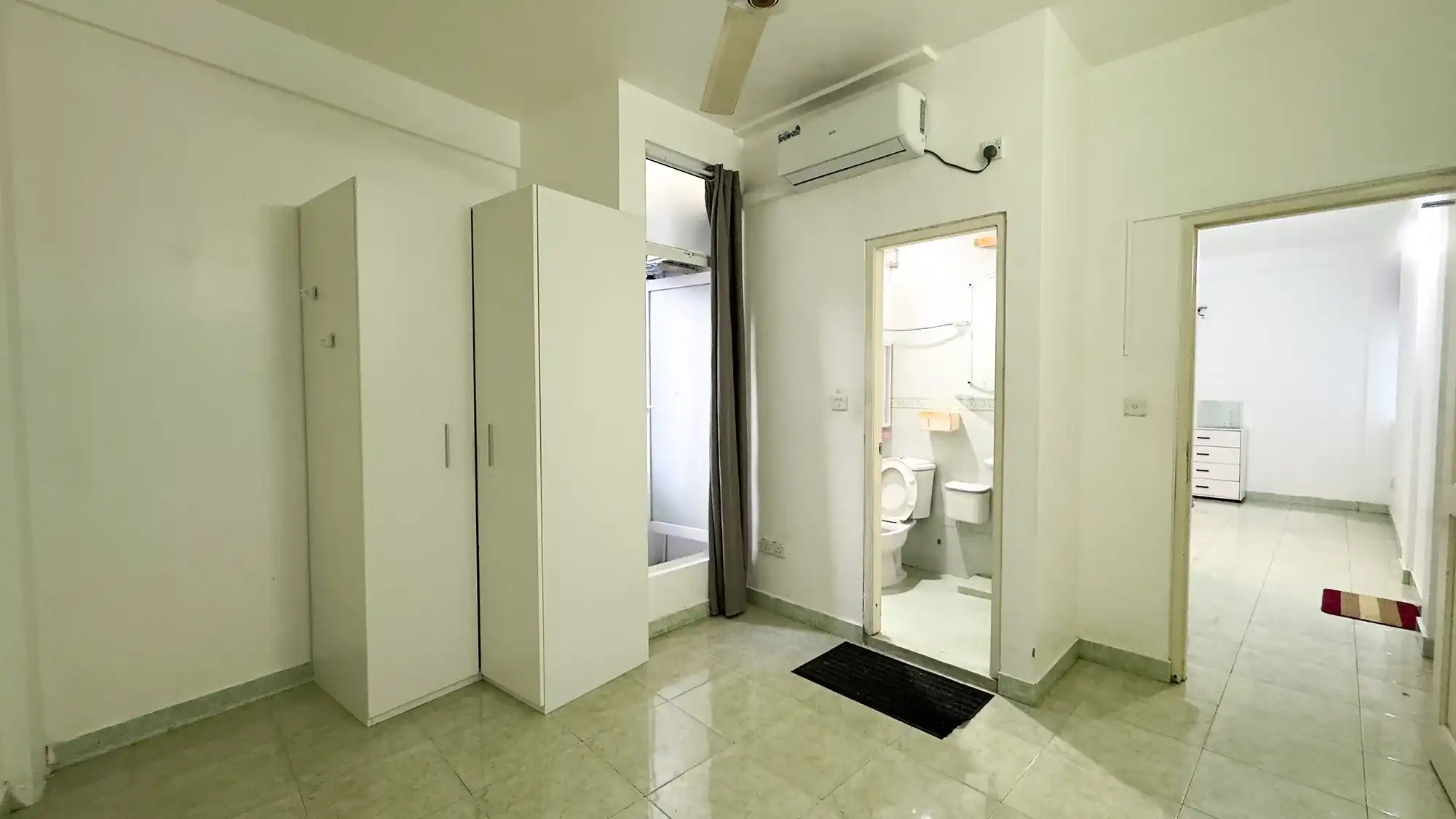 The bedroom is air-conditioned and includes a small balcony. The unit is positioned towards the rear side of the building, with the balcony facing the adjacent building, offering a more private and quieter setting away from the main road.